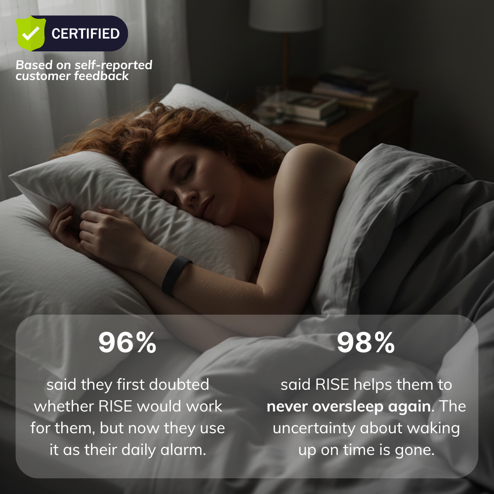 I tried everything, Apple Watch, Fitbit, everything, and slept through them all. Got the Rise Band six months ago and haven't overslept once. The vibration actually wakes me up without being too harsh, and the best part? I can travel with it.